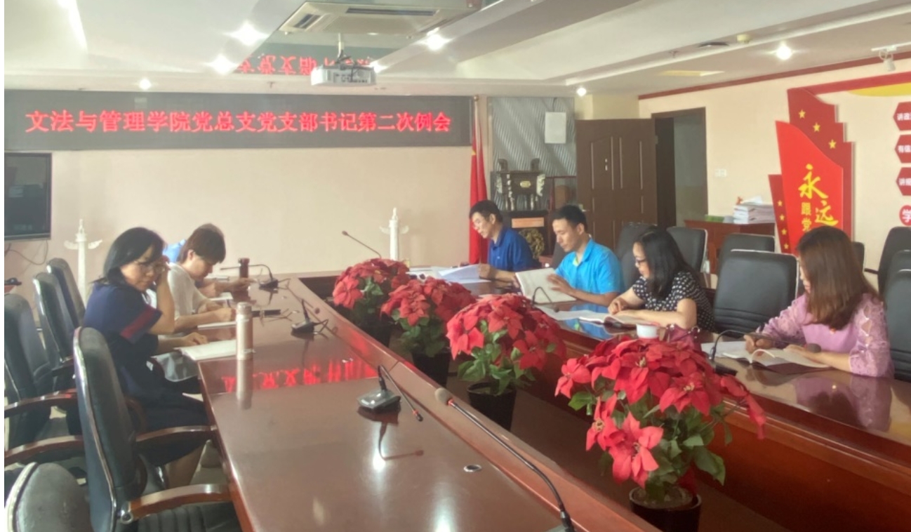 2021年6月26日中午一点,文法与管理学院党总支在学院会议室召开了本学期第二次党支部书记工作例会,学院党总支委员、党支部书记参加了会议,党总支书记杨岭主持会议。