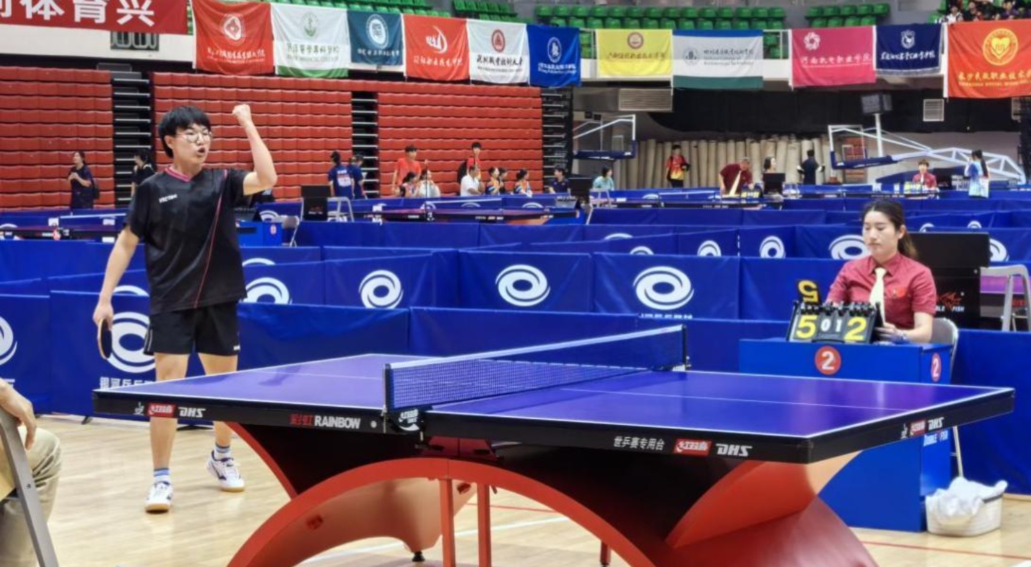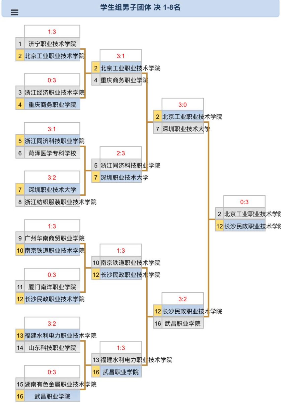 我校乒乓球队在本届比赛中厚积薄发,队员们的表现可圈可点,每个人都拼出了自己应有的竞技水准,凭借顽强的意志品质一路闯进决赛。团体赛与湖南省冠军队长沙民政职业技术学院和浙江省冠军队台州职业技术学院同组,队员们坚定信心、敢打敢拼,合理执行教练的战术意图,积极主动控制比赛节奏,顺利进入第二阶段淘汰赛,势如破竹淘汰山东省冠军济宁职业技术学院,历史性闯入全国锦标赛团体赛8强。接下来队员们状态越来越好,势气高涨。四分之一决赛小伙子们团结奋战,以3:1战胜重庆商务职业学院,半决赛3:0战胜深圳职业技术大学,首次挺进冠亚军决赛。此次比赛水平高、赛程紧,我校男团没有足够的轮换队员,靠坚强的意志品质打到决赛,遗憾地以0:3负于男团劲旅长沙民政职业技术学院,虽败犹荣获得男团亚军,再次实现历史性突破。