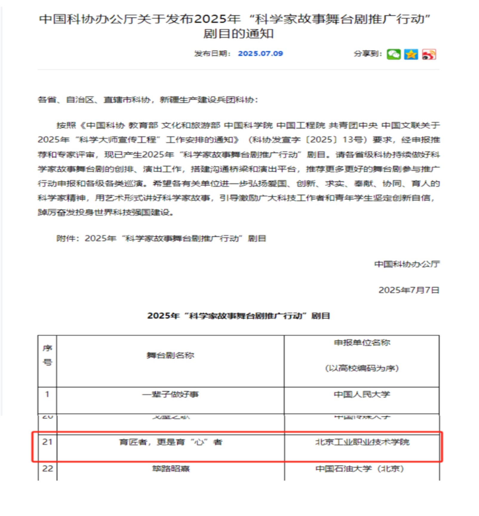 7月9日,中国科学技术协会公布2025年“科学家故事舞台剧推广行动”剧目名单,我校原创舞台剧《育匠者,更是育“心”者》成功入选。