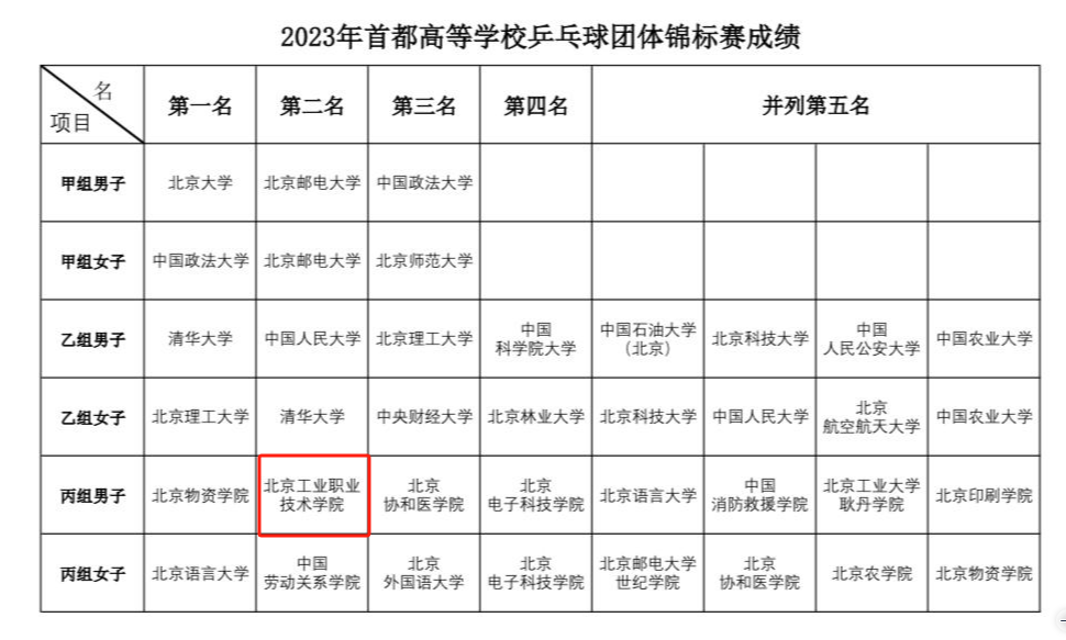 在本次比赛中,乒乓球队师生团结一心、众志成城,坚定信心、放手一搏,打出了北工院乒乓球队的风采,展现了中华体育精神。在小组赛中,以两个3:0分别战胜了国际关系学院和中国劳动关系学院,晋级第二阶段淘汰赛。