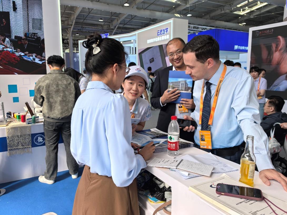 北京市纪委市监委驻市委教育工委纪检监察组组长易帅东莅临我校展位,我校国际交流合作处处长孟晴为其讲解我校国际化办学成果