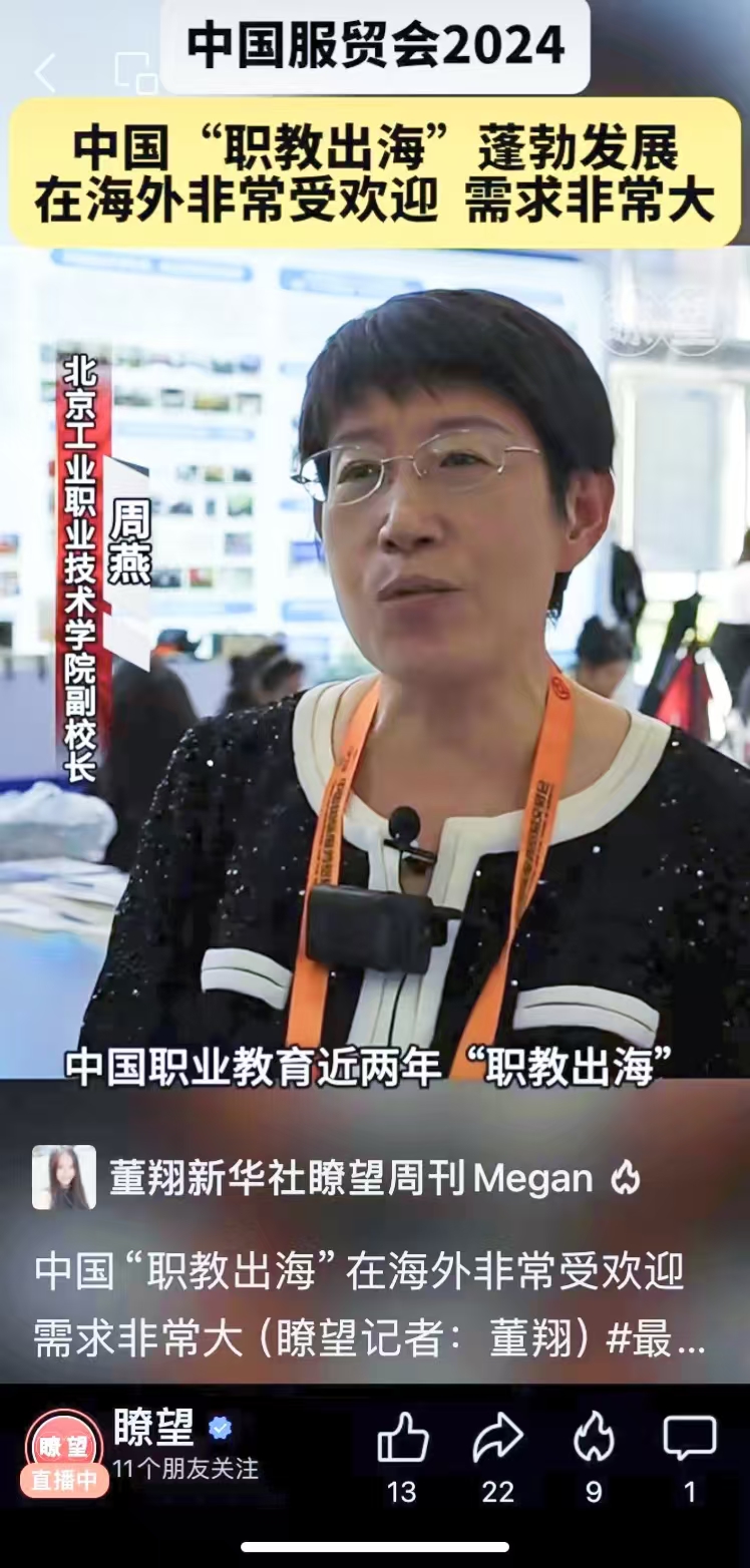 参展期间,我校的国际化办学成果展示也受到了国内多家主流媒体的关注,央视新闻直播、新华通讯社瞭望等多个融媒体平台对我校展位进行了专题采访以及直播报道。