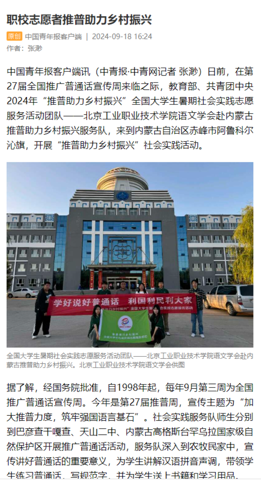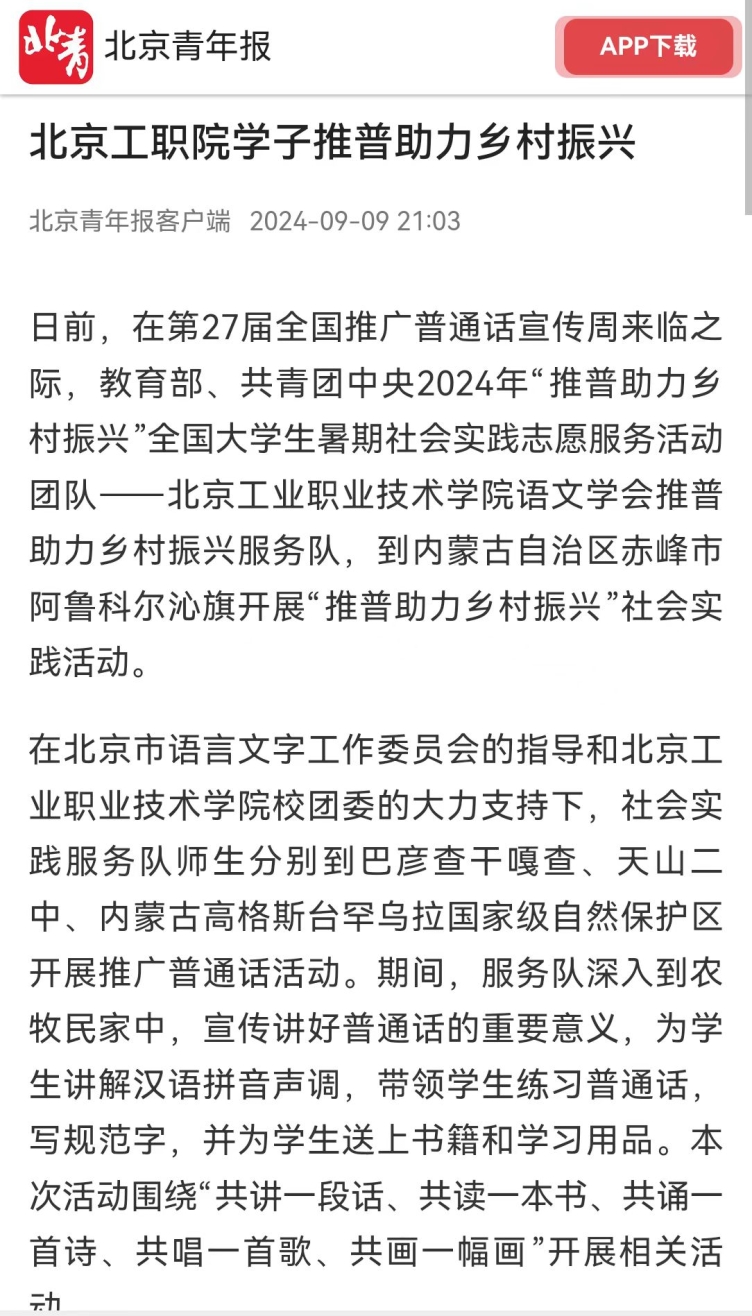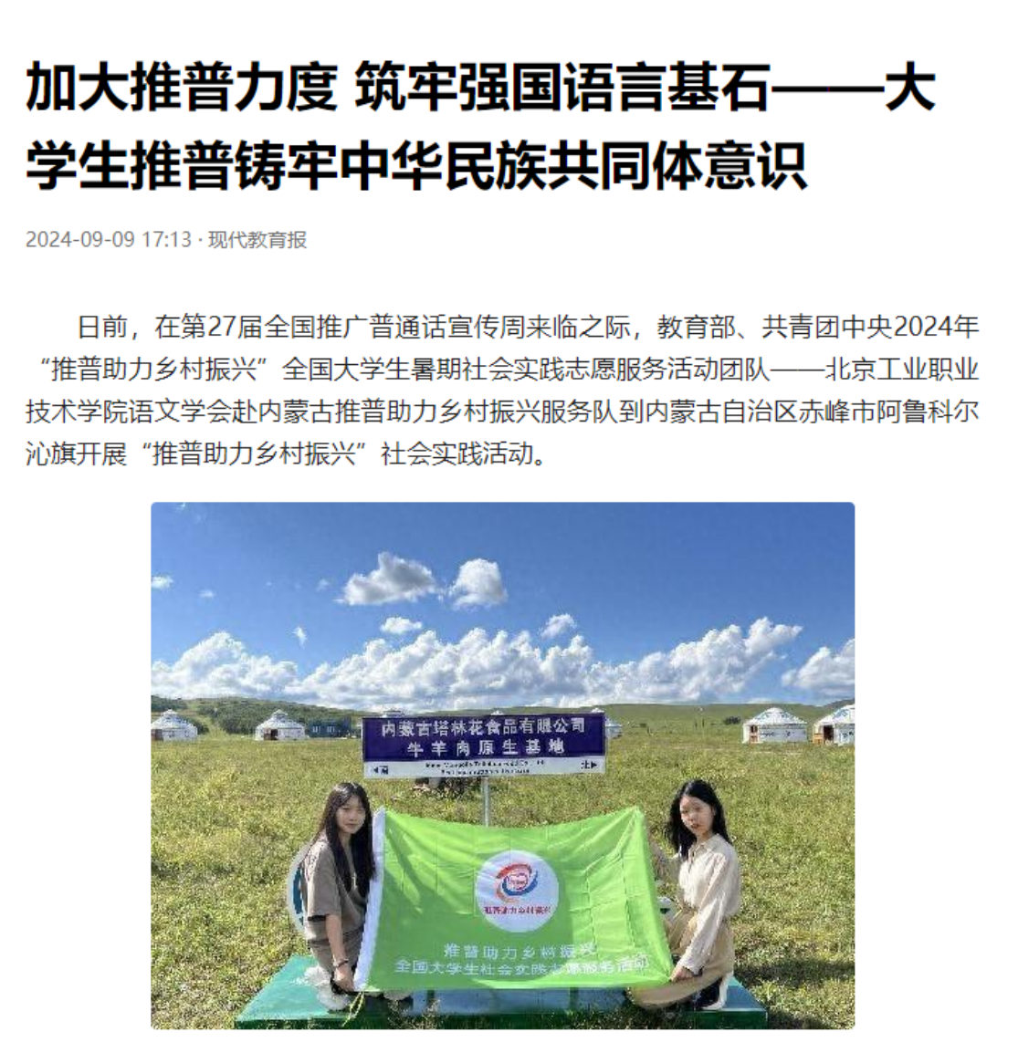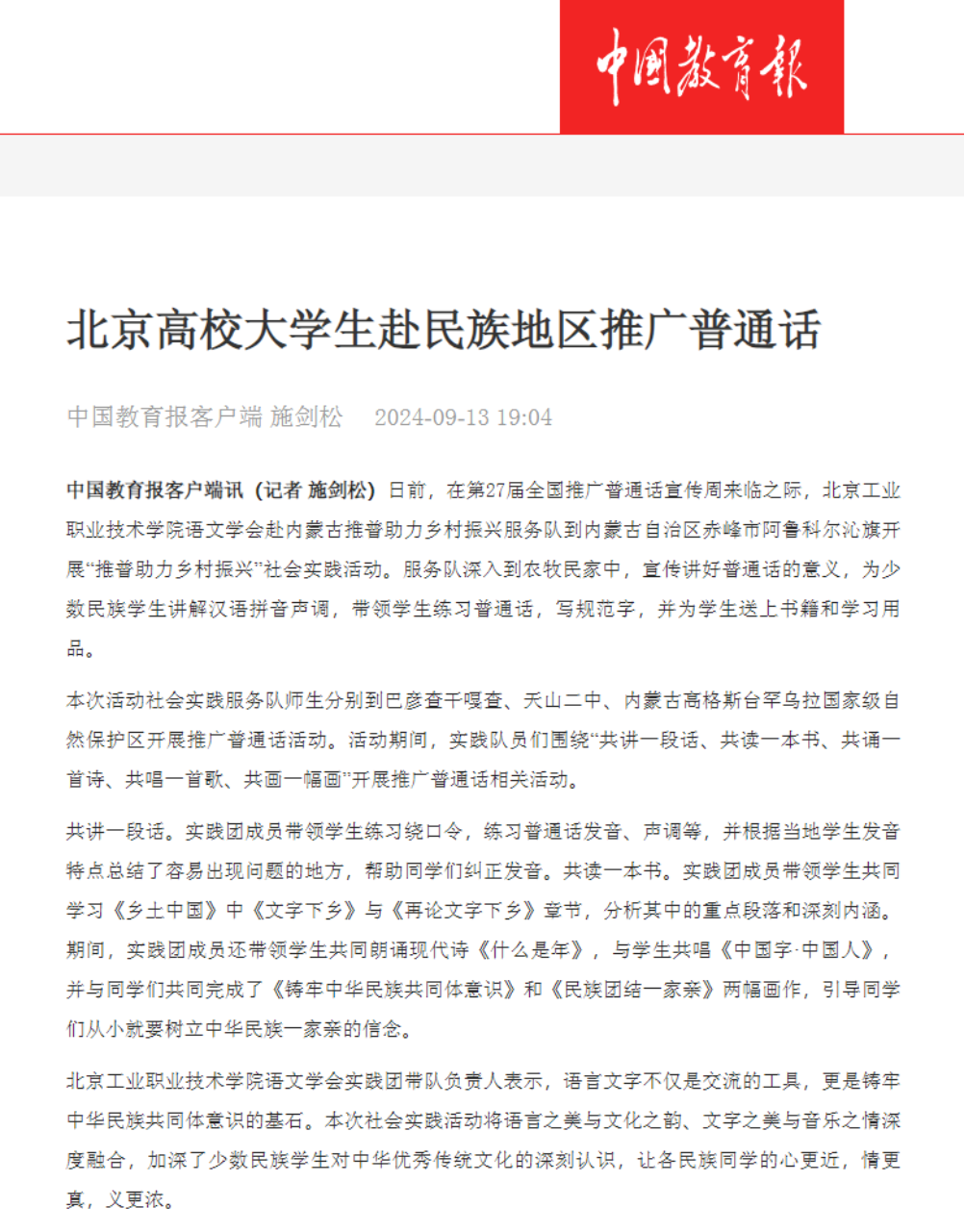 日前,在第27届全国推广普通话宣传周来临之际,教育部、共青团中央2024年“推普助力乡村振兴”全国大学生暑期社会实践志愿服务活动团队——华体会网页版语文学会赴内蒙古推普助力乡村振兴服务队到内蒙古自治区赤峰市阿鲁科尔沁旗开展“推普助力乡村振兴”社会实践活动。将语言之美与文化之韵、文字之美与音乐之情深度融合,加深少数民族地区对中华优秀传统文化的深刻认识,铸牢中华民族共同体意识,让各民族同学的心更近,情更真,义更浓。本次社会实践活动得到了《中国教育报》《中国青年报》《现代教育报》《北京青年报》的关注和报道。