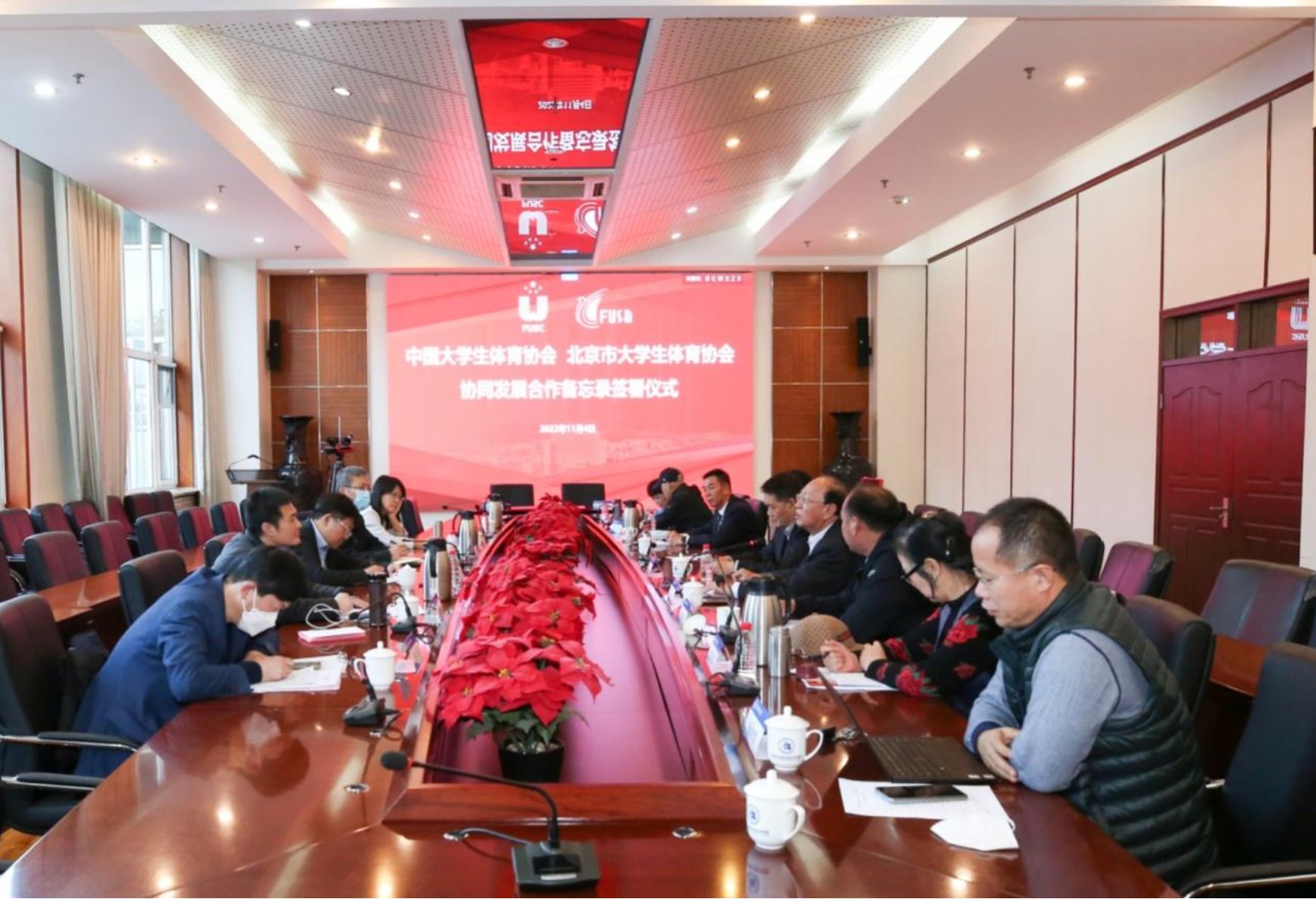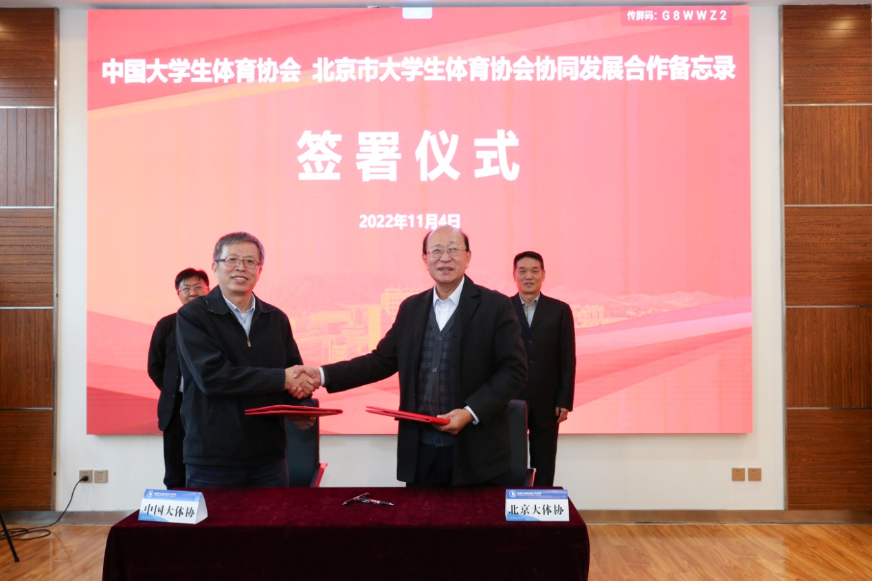 为凝聚共识、深化合作,共同推动大学生体育事业高质量发展,换届大会结束后,中国大学生体育协会与北京市大学生体育协会举行了协同发展合作备忘录签署仪式,与会代表进一步就协调发展方向和项目开展,及面临的发展机遇、问题和挑战及设想等方面进行了深入座谈。北京市大学生体育协会副主席贾书申主持了签署仪式。