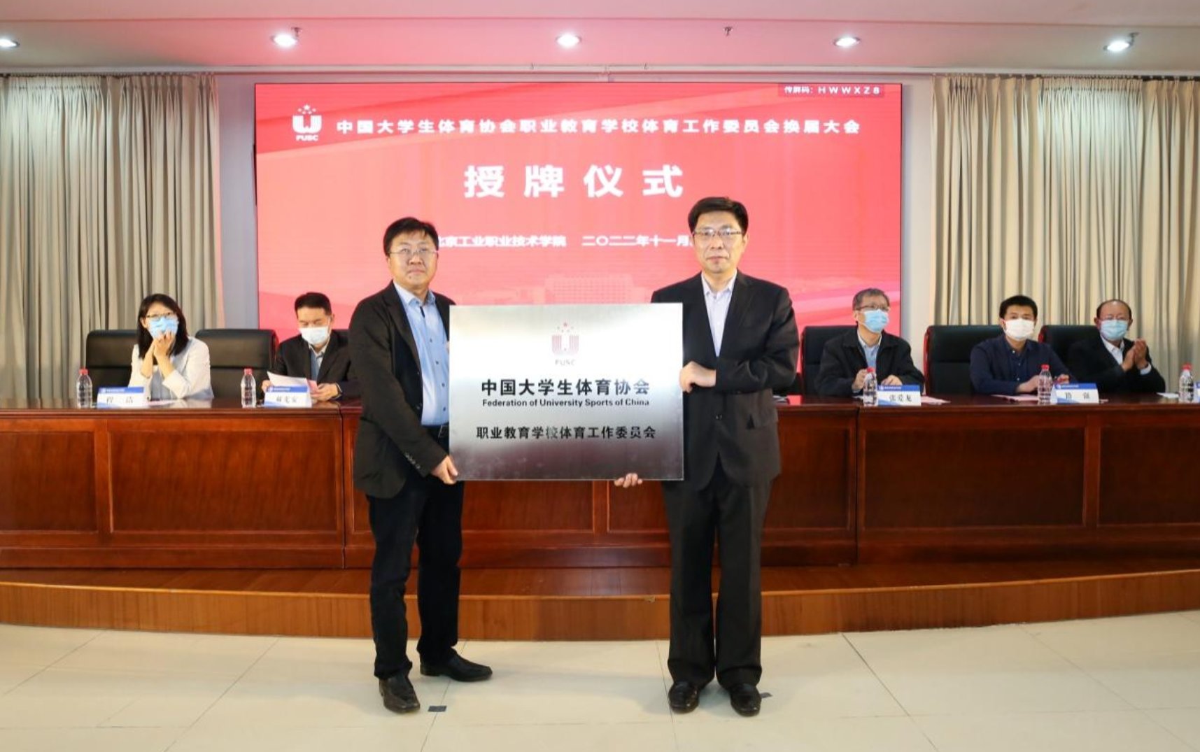 11月4日,中国大学生体育协会职业教育华体会网页版体育工作委员会换届大会以线上线下相结合的方式在我校召开。教育部学生体育协会联合秘书处秘书长刘立新,教育部学生体育协会联合秘书处副秘书长、中国大学生体育协会副主席兼秘书长张爱龙,中国大学生体育协会竞赛部主任程洁、综合部主任籍强,北京市教育委员会体育卫生与艺术处副处长张志华,北京市大学生体育协会主席郝光安、副主席刘波、杨慈洲、秘书长张威,我校党委书记高喜军,中国大学生体育协会职业教育华体会网页版体育工作委员会拟任主席、我校党委副书记、院长安江英,职业教育华体会网页版体育工作委员会拟任秘书长贾书申等领导出席会议,我校体育部梁赋书记和体育老师现场参加了换届大会,中国大学生体育协会职业教育华体会网页版体育工作委员会388所会员华体会网页版的400多位代表出席视频会议。中国大学生体育协会协会事务部主任李兵主持会议。
