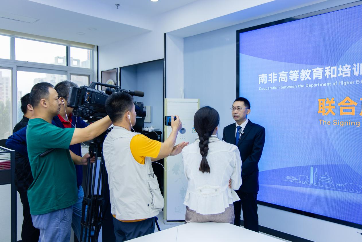 签约仪式结束后,柳长安院长与南非高教部西西总司长共同接受了北京电视台和中国教育电视台等媒体的采访,分别就此次中南双方教育合作的未来着力点给与解答。