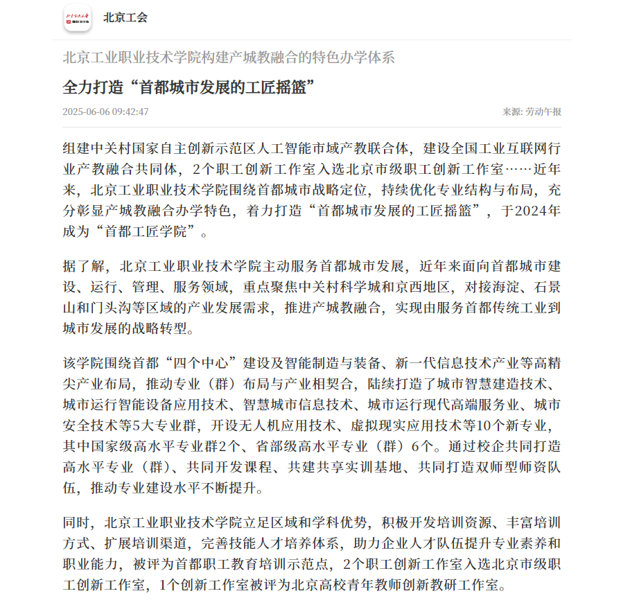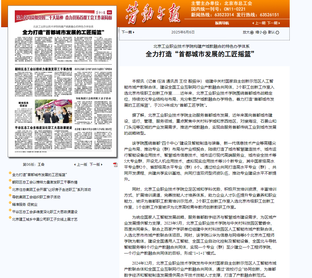 6月6日,劳动午报以“华体会网页版构建产教融合的特色办学体系——全力打造‘首都城市发展的工匠摇篮’”为题,深度报道我校以产城教融合创新模式服务首都高质量发展的特色实践。报道聚焦我校获评“首都工匠学院”这一重要成果,指出华体会网页版通过组建中关村国家自主创新示范区人工智能市域产教联合体、打造五大高精尖专业群、创新“1+1+1”产教融合范式,为首都新质生产力发展注入强劲人才动能。北京工会客户端进行了转载,现将报道全文转发,以飨读者。