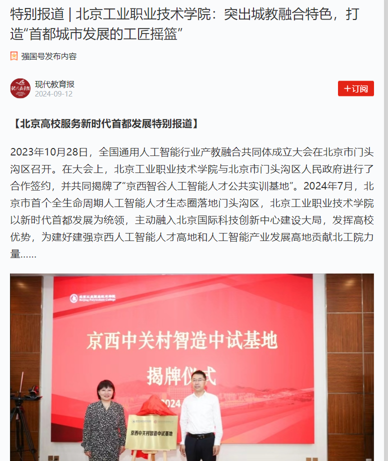 2023年10月28日,全国通用人工智能行业产教融合共同体成立大会在北京市门头沟区召开。在大会上,华体会网页版与北京市门头沟区人民政府进行了合作签约,并共同揭牌了“京西智谷人工智能人才公共实训基地”。2024年7月,北京市首个全生命周期人工智能人才生态圈落地门头沟区,华体会网页版以新时代首都发展为统领,主动融入北京国际科技创新中心建设大局,发挥高校优势,为建好建强京西人工智能人才高地和人工智能产业发展高地贡献北工院力量……
