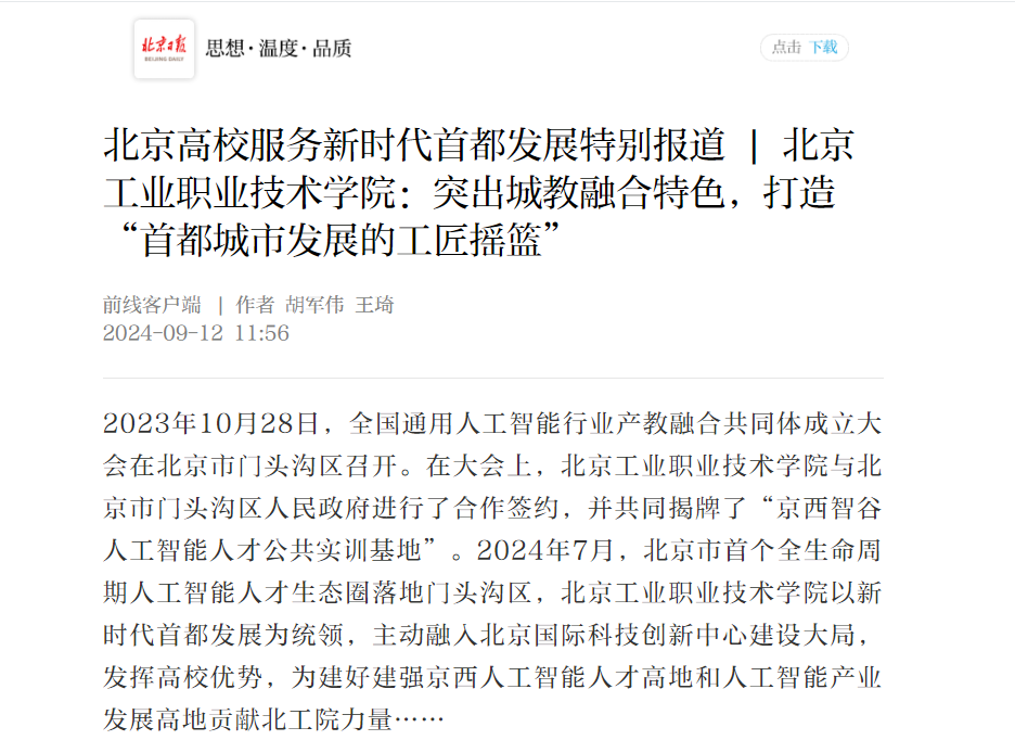 近日,市委教育工委联合前线杂志社推出“北京高校服务新时代首都发展特别报道”,生动展现北京市属高校发挥自身优势服务首都城市发展建设的典型事迹和突出成绩。9月12日,华体会网页版特别报道《华体会网页版:突出城教融合特色,打造“首都城市发展的工匠摇篮”》在前线客户端发表,该报道同时被中国网、光明网、北京日报、现代教育报、学习强国、新浪网等主流媒体进行转载。展现华体会网页版作为首都职业教育的“排头兵”,以新时代首都发展为统领,紧紧围绕首都城市战略定位,突出“城教融合”办学特色,致力于打造“首都城市发展的工匠摇篮”,取得的一系列标志性成果。