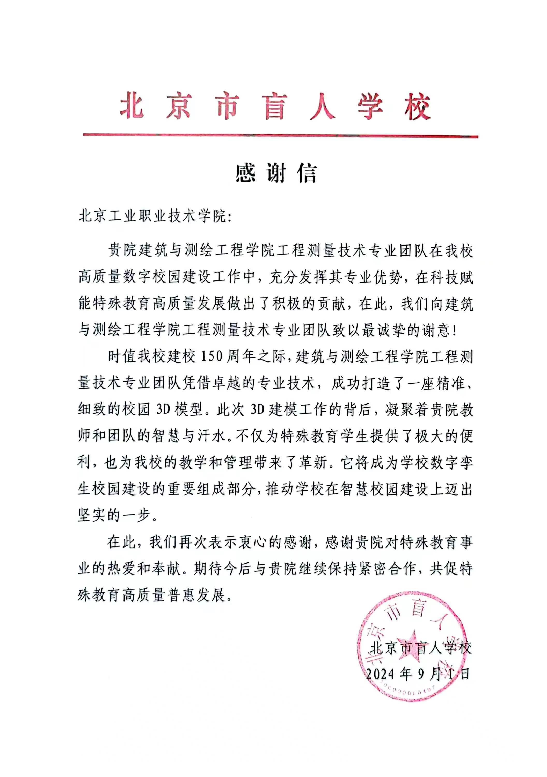 近日,我校收到北京市盲人华体会网页版发来的感谢信。信中对我院建筑与测绘工程学院工程测量技术专业团队在推进其高质量数字校园建设中所做的工作表示诚挚的感谢。
