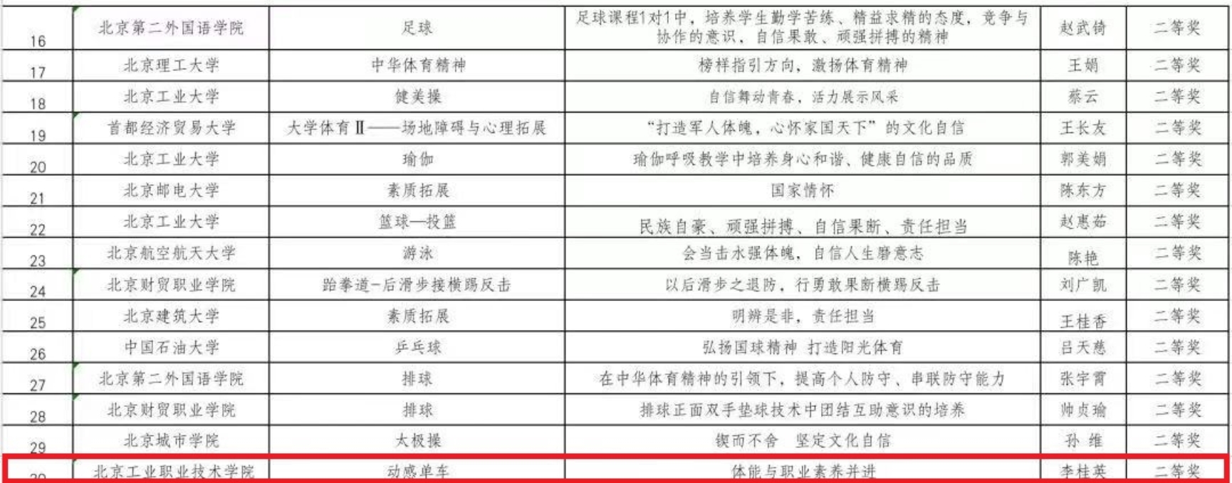 为深入贯彻落实习近平总书记关于教育、体育的重要论述和全面落实全国教育大会精神,根据中共中央、国务院《深化新时代教育改革评价总体方案》等文件的工作部署,深入落实三全育人工作,首都高校体育思政研究会于2023年6月开展体育课程思政教学案例的征集工作。我校体育部针对此项工作,成立5个体育项目团队进行教学案例撰写和课程录制工作,提交申报了八段锦、动感单车、武术、篮球、网球等五个项目课程思政教学案例。经首都高校体育思政研究会专家组的严格评审,我校体育部申报的五门课程教学案例全部奖项。