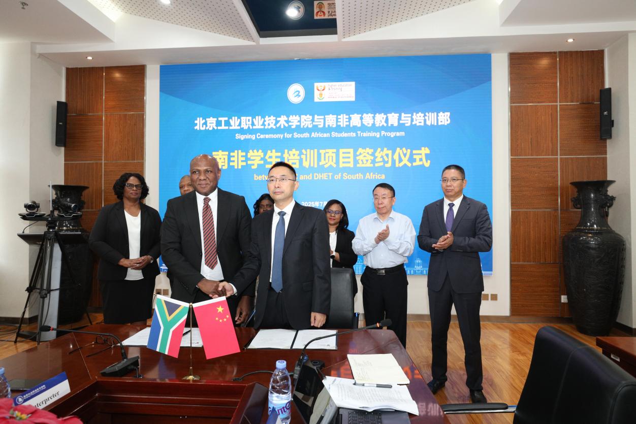 此次访问成效显著,中非双方取得突破性合作成果。成功签署具有里程碑意义的《南非学生来华培训项目协议》,构建了北工院与南非高教部职业教育常态化交流合作机制。协议签署为南非技能型人才成长开辟了新通道,将推动产教融合的国际合作向纵深发展,充分彰显了我校在服务国家外交大局及“一带一路”倡议中的示范引领作用,为打造中国特色、世界水平的职业教育品牌注入新动能。