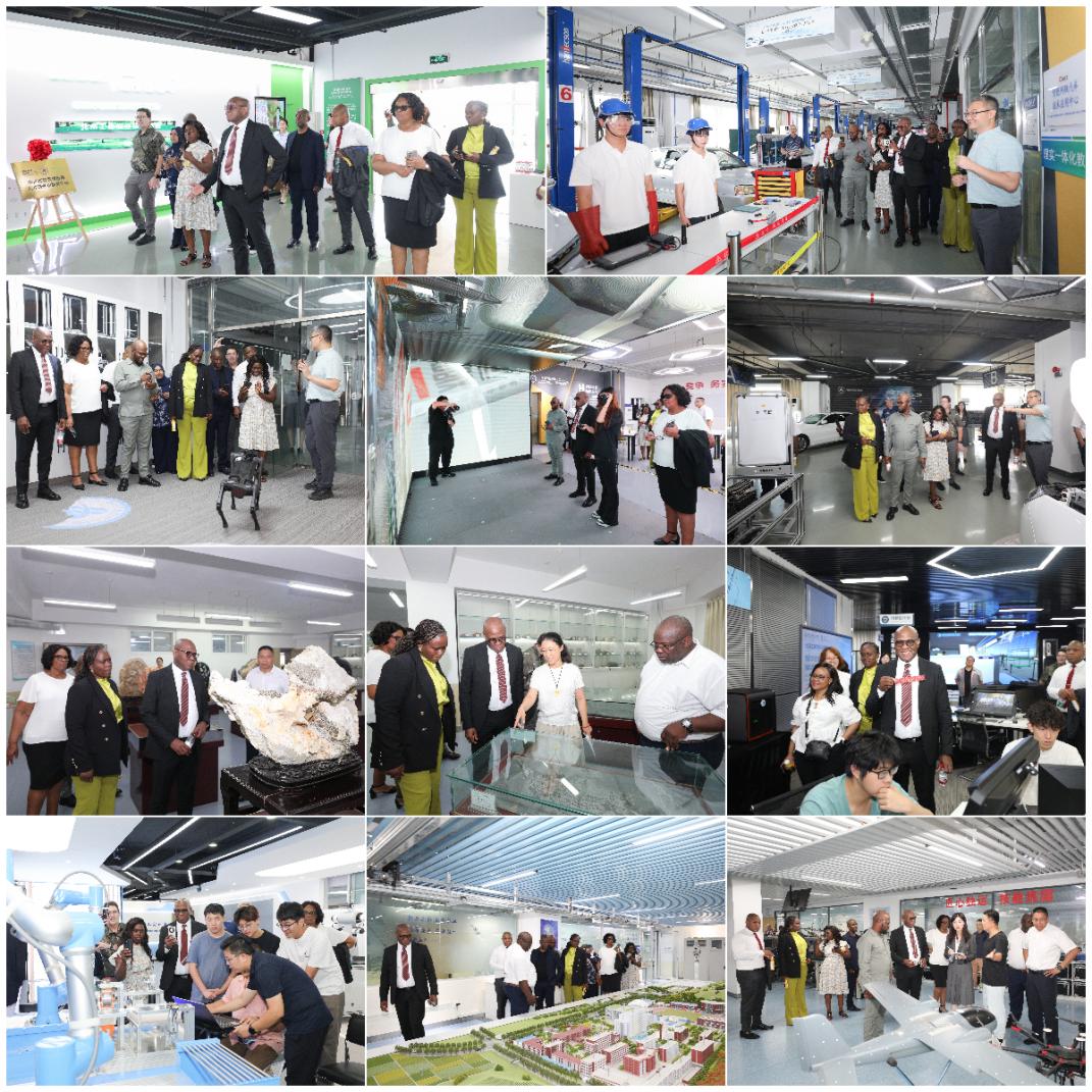 在高世吉的陪同下,南非高教部代表团一行人还参观了我校中法施耐德能效管理应用人才培养和研究中心、汽车实训基地、3D打印实训中心、机器人实训基地、珠宝展览馆、珠宝设计大师工作室、智能建造实训基地、智能网联汽车实训室、北斗时空信息产业学院、科大讯飞人工智能工坊实训室、人工智能创新应用实训基地等实训室,参观了国际学生公寓和华体会网页版食堂等与国际学生在华学习、生活密切相关的各项设施。代表团对我校理实一体的教学模式、先进的实训设备、优美的校园环境、以及完备的留学生配套服务设施深表赞赏,穆希姆贝职业技能学院副校长博伊表示:“这趟行程让我们对合作充满信心”。