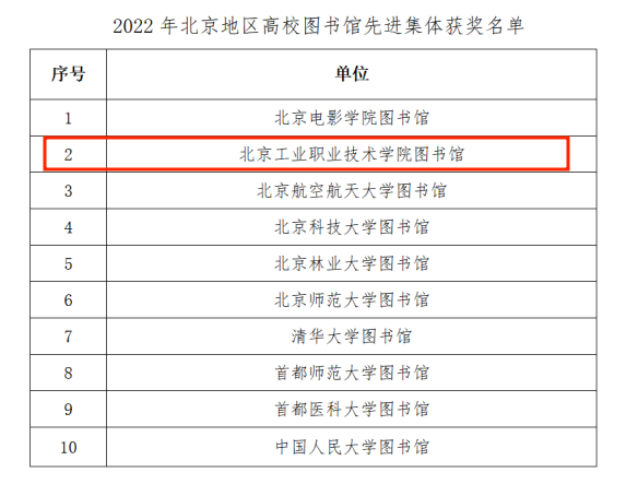 会议表彰了先进集体10个、优秀馆长10名及优秀馆员103名。我校图书馆被评为“2022年北京地区高校图书馆先进集体”,是10所获先进集体高校图书馆中唯一一所高职院校。