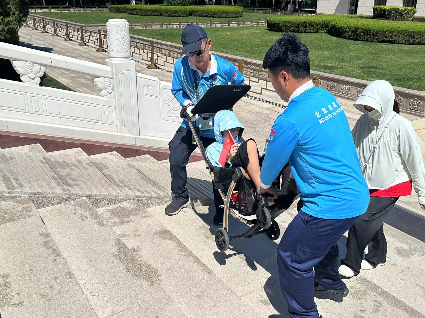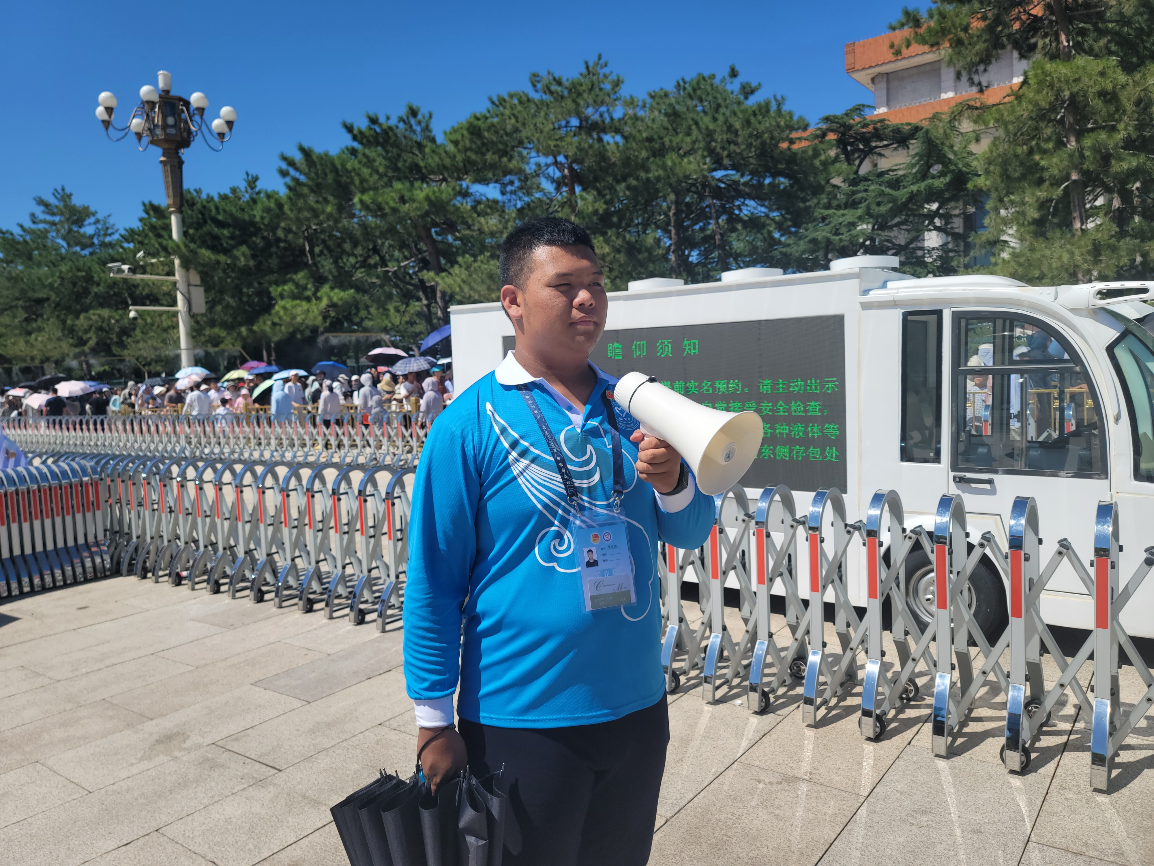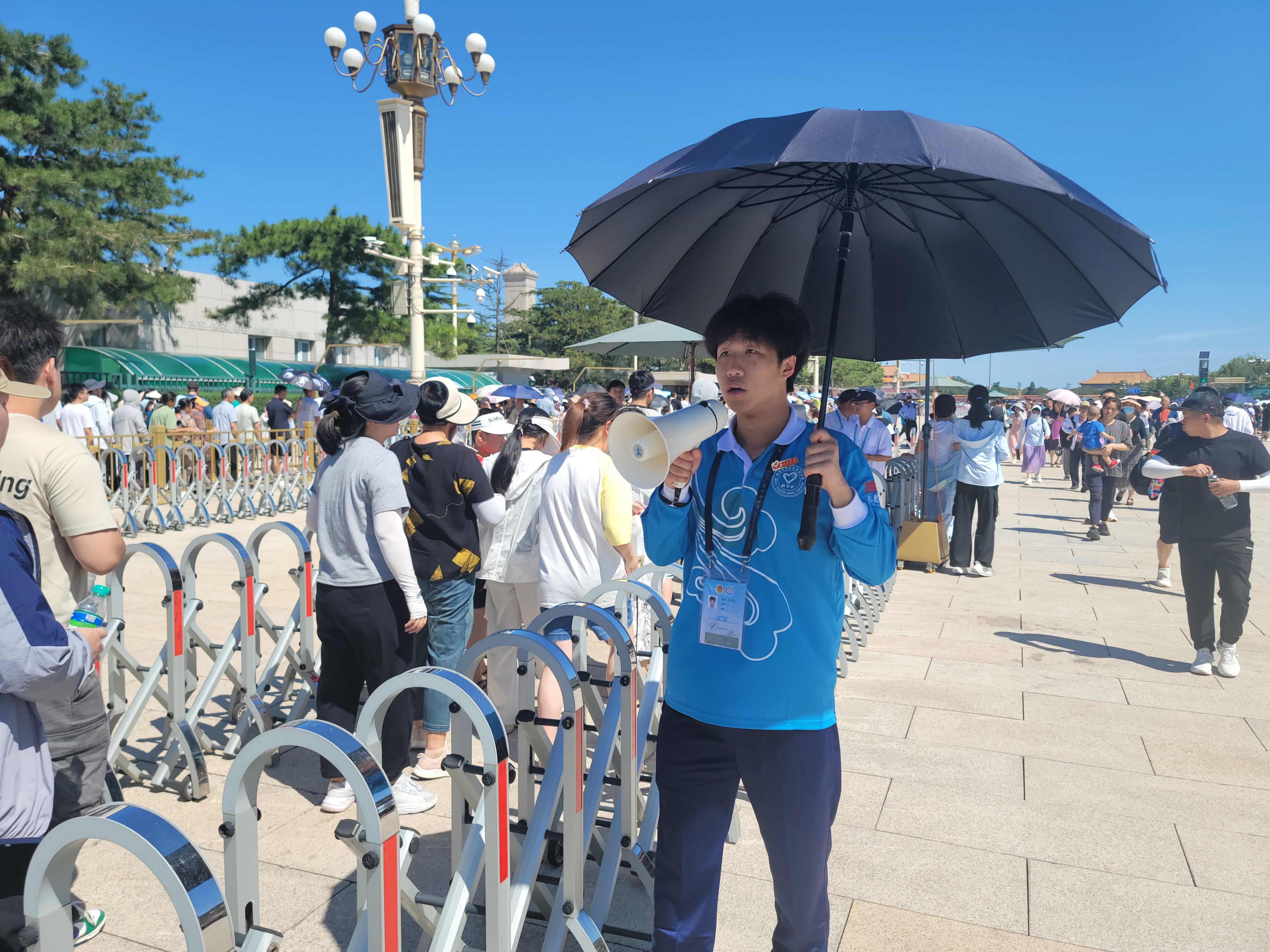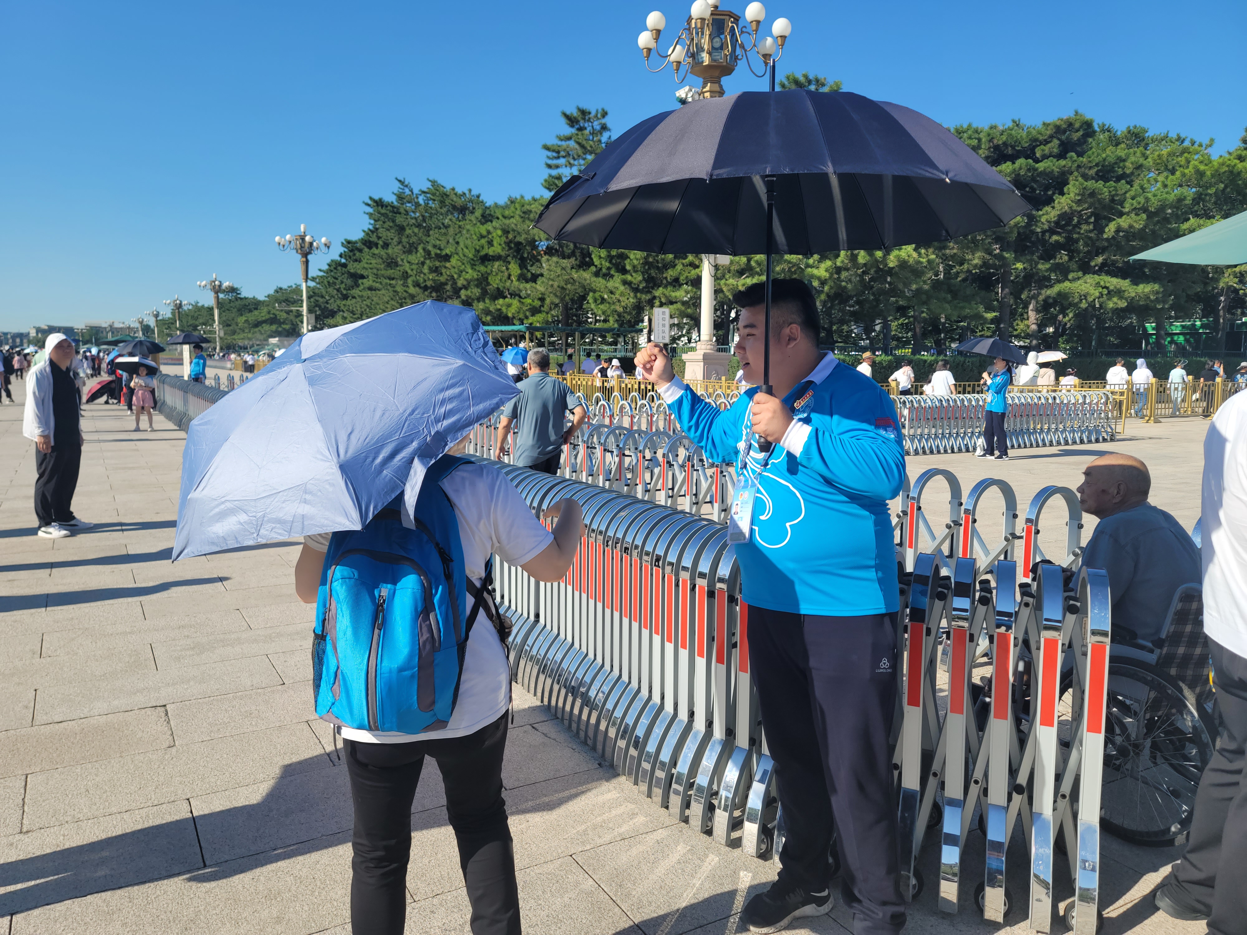 随着大暑临近,北京连日高温,户外开启“炙烤模式”,烈日下的天安门广场地表温度持续升高,志愿者们紧张而有序地在团队预约岗提供预约帮助,耐心负责,答疑解惑,在扶老助残岗帮助群众上下楼梯,在外围岗指引群众,不畏酷暑,坚守岗位,引导大家有序瞻。