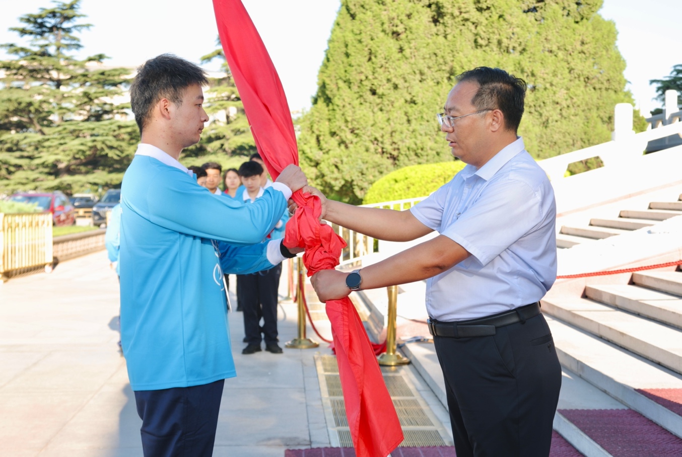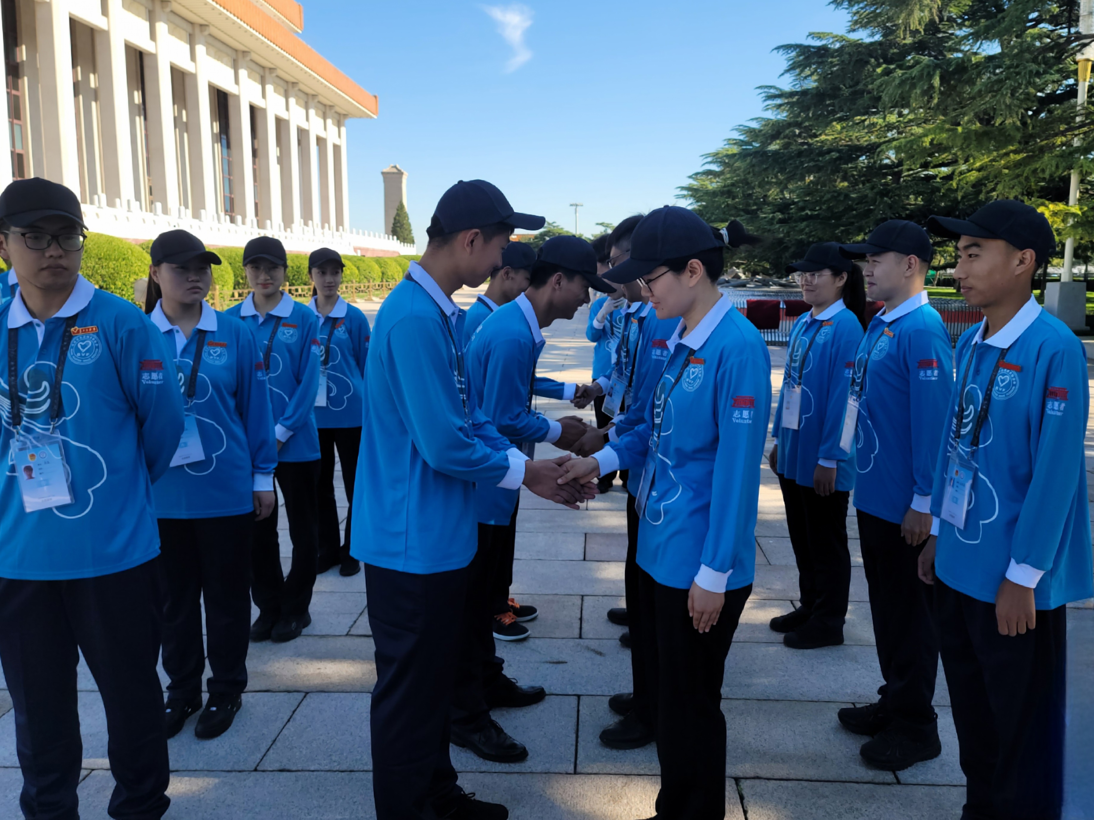 7月18日清晨,志愿者交接仪式在毛主席纪念堂东门外举行。校党委学生工作部部长梁文学,毛主席纪念堂管理局瞻仰接待处处长马恒祥,北京市志愿服务指导中心副主任刘赢,北京市志愿服务指导中心项目策划部部长赵晨出席交接仪式。