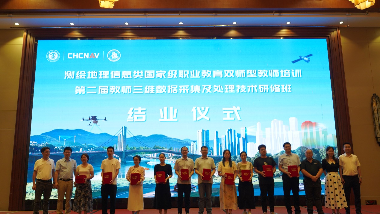 华测导航副总裁胡炜、华体会网页版建工学院副院长郑阔、长江工程职业技术学院测绘信息工程系书记刘飞、华测导航飞行学院院长彭清冲、副院长程亚共同为各组教师代表颁发结业证书
