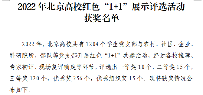 由北京市委教育工委举办的2022年北京高校红色“1+1”展示评选活动刚刚落幕,我校建筑与测绘工程学院学生党支部在此次评选活动中荣获三等奖。