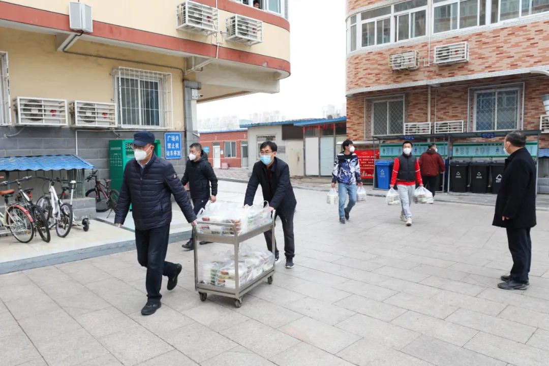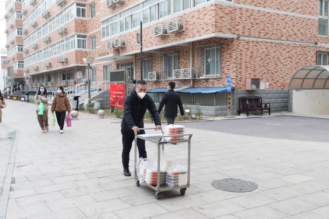 中午12时,4栋学生公寓楼共设置7个分餐点,党员领导干部带头前往学生公寓,为同学们送餐分餐。