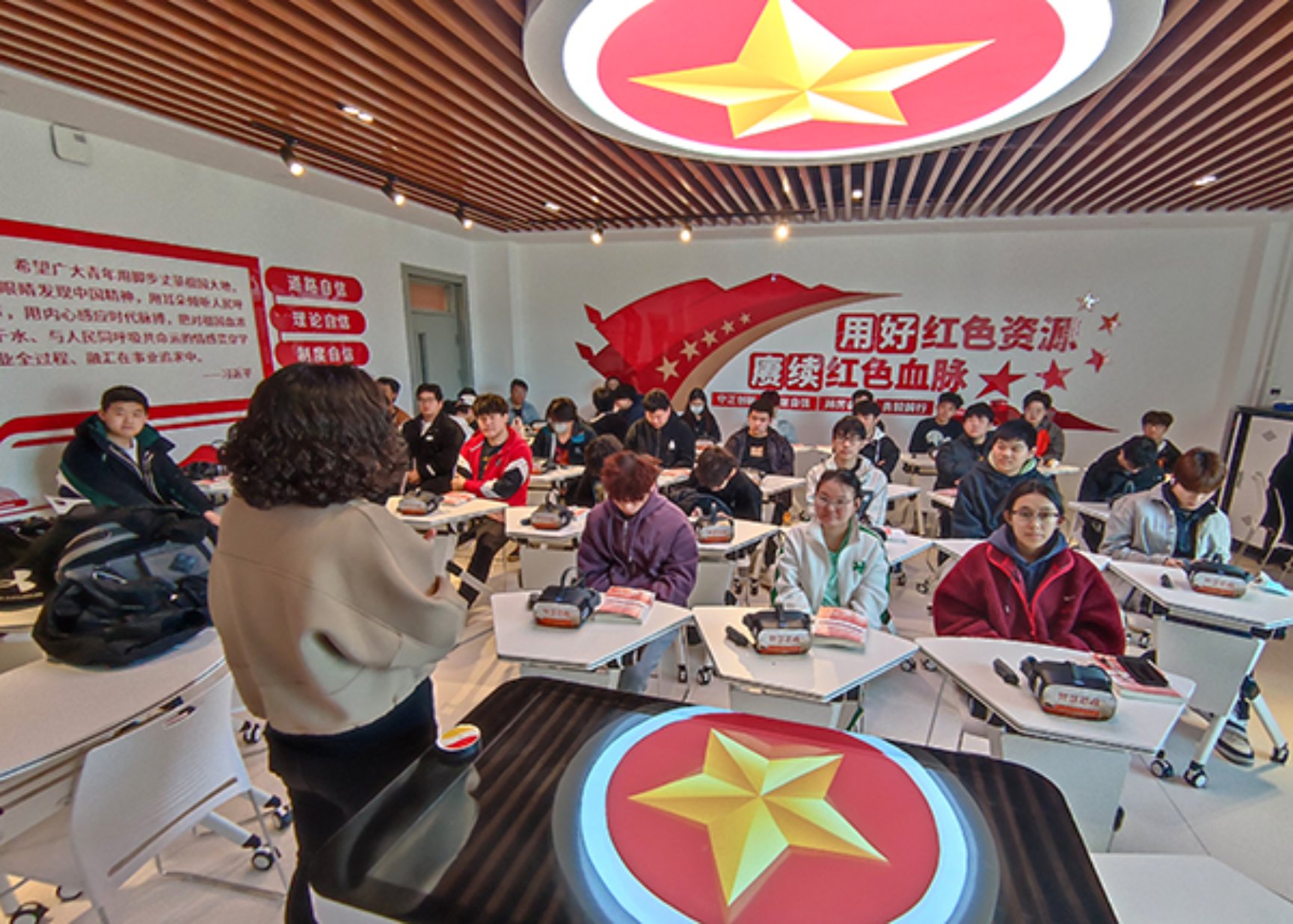 本教学中心配备50台/套VR思政学习机和思政智慧沙盘,可以满足一个标准班级开展VR思政课实践教学体验。虚拟仿真教学资源丰富,包括中国共产党党史、新中国史、社会主义发展史、改革开放史、习近平新时代中国特色社会主义思想等系列主题内容和沉浸式、展馆式、答题式等课程资源类型,能较好的服务于思政课实践教学环节。