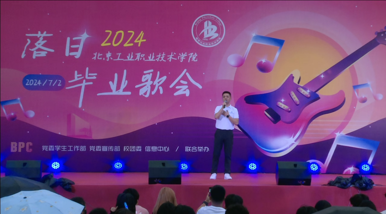 校党委学生工作部部长梁文为幸运观众颁发北工院“落日毕业歌会”周边