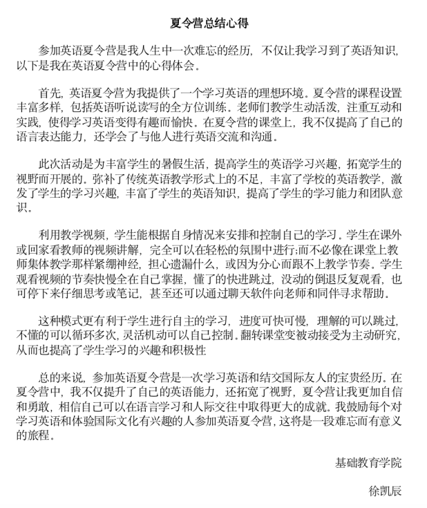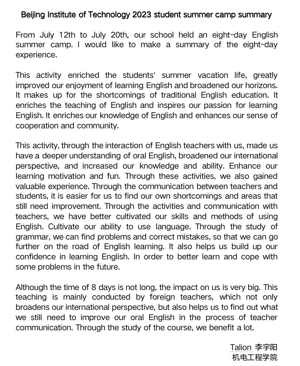 7月14日,2023年学生跨文化交际及语言应用能力提升夏令营顺利开营,目前此次夏令营已圆满结束。本次夏令营为我校50名优秀学子提供了多样化国际化的教学内容和文化体验。此次夏令营注重语言应用能力和跨文化交际技巧,精心设计的语言实践活动锻炼了学生们的口语表达和交际能力,让他们在轻松愉快的氛围中自信地运用语言并展示自我。此外还有云参访的特色板块——“探寻剑桥”的奇妙之旅和“云游大英博物馆”的文化体验。让学生们沉浸在学术氛围中,激发思维火花。在展示汇报中,学生们以生动有趣的方式进行主题练习,展示了他们在夏令营中取得的语言进步。